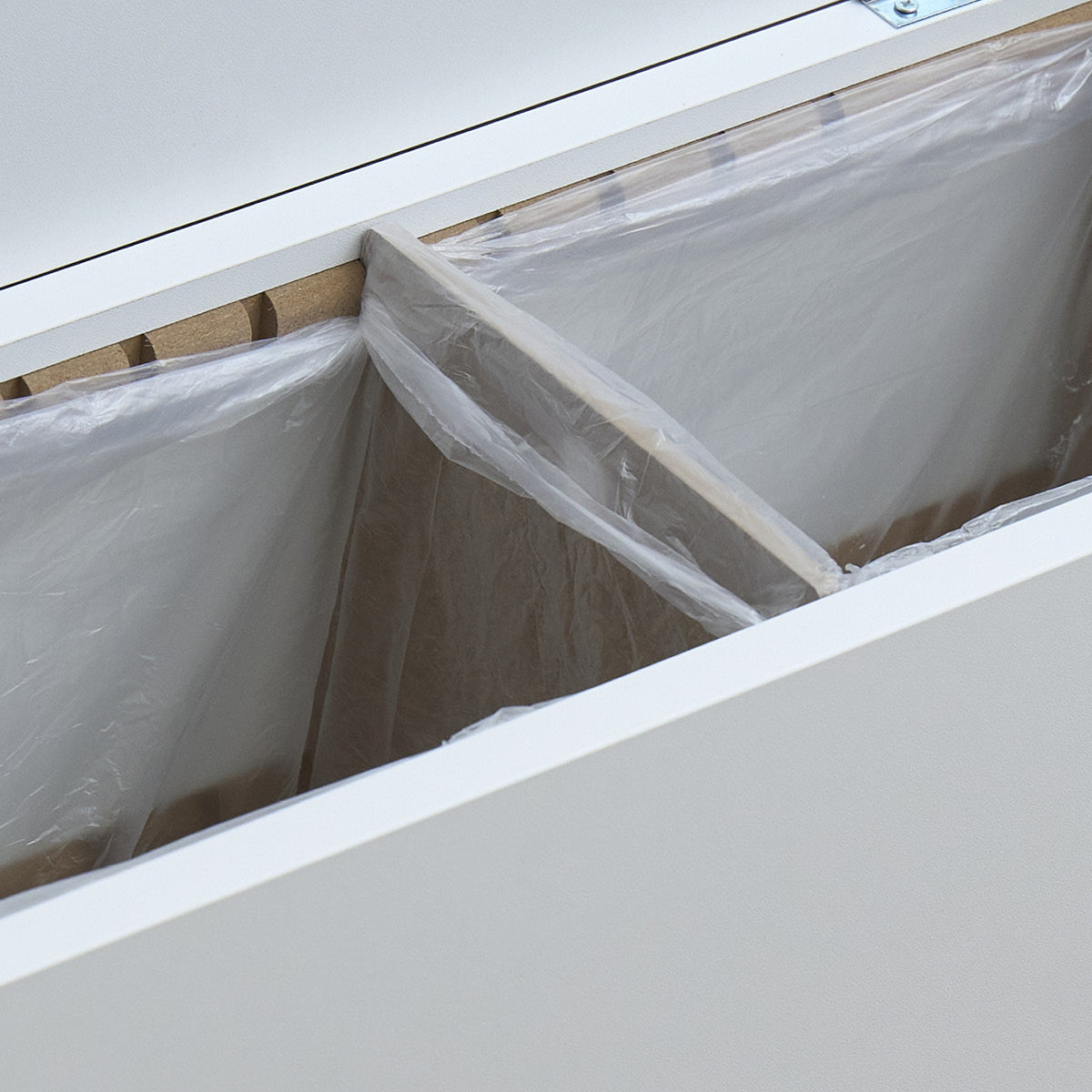 Møblerne er bygget op omkring vores unikke skillevægssystem, der sikrer optimal udnyttelse af pladsen. Med bevægelige paneler kan du tilpasse rummene præcis efter dine behov – til affaldssortering eller opbevaring.